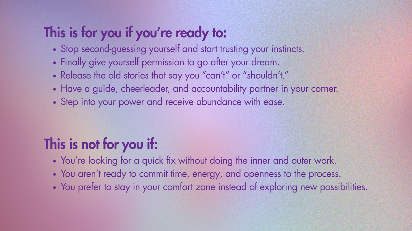 You don’t have to figure it all out alone — I’m here to walk beside you, hold the vision when you forget it, and remind you of your power until you can’t help but believe in it yourself.